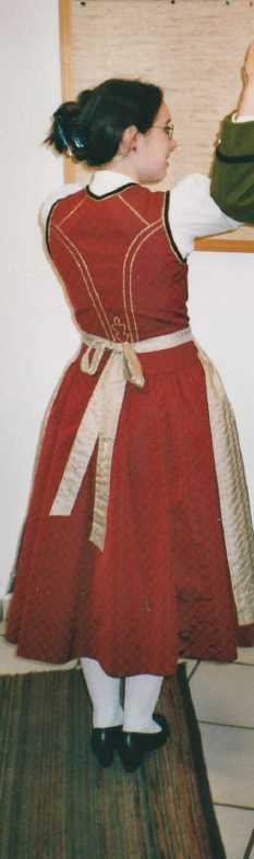 Den Ausschnitt des Vorderteils ziert ein 4-facher Bogen dieser Goldborte. Das Vorderteil wird mit Haftln verschlossen. Im Rückenteil sind die formgebenden Nähte mit der Goldborte verdeckt. Im mittleren Rückenteil, ausgehend vom Rockbund, ist die Goldborte in Form eines Eichenblattes aufgenäht.